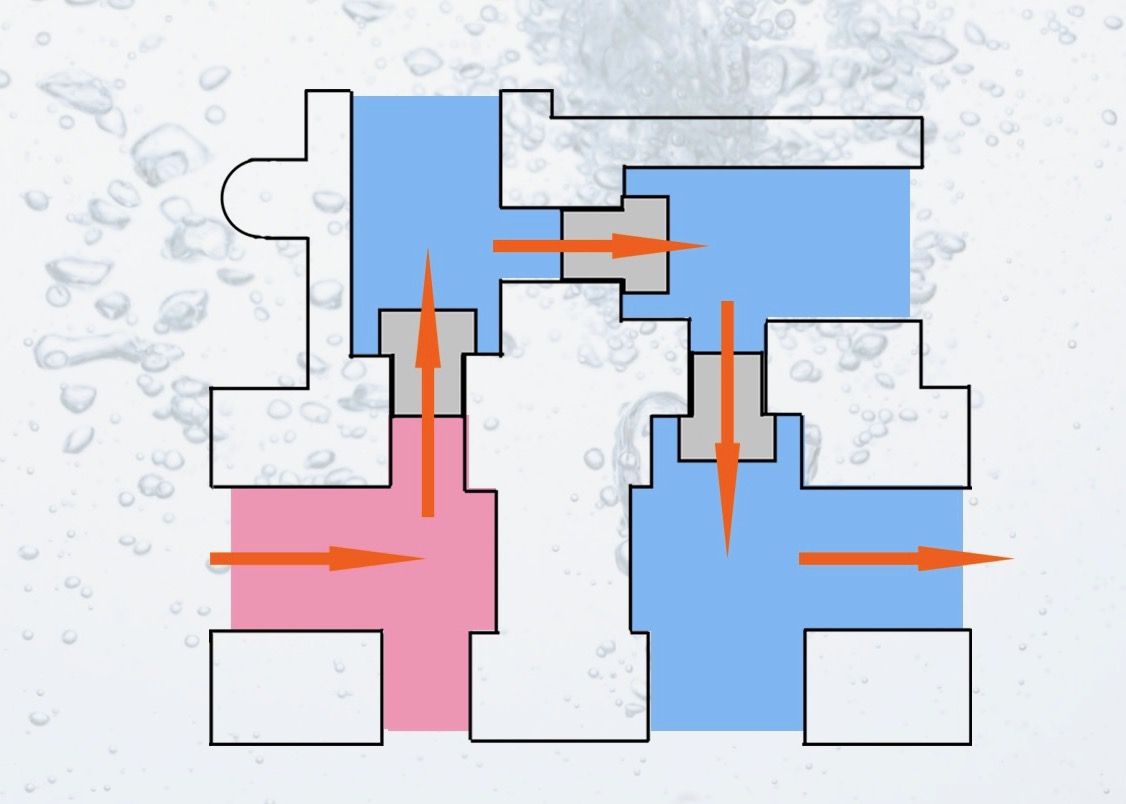 ノズルを連続で通すことで圧力損失させシール効果を高め、大きいノズル口径で対応可能に